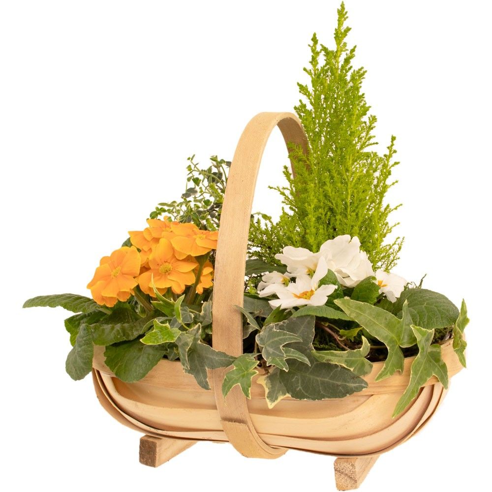 Natural softwood trug basket, lovingly enclosed with an embracing hoop & finished with sturdy handle.