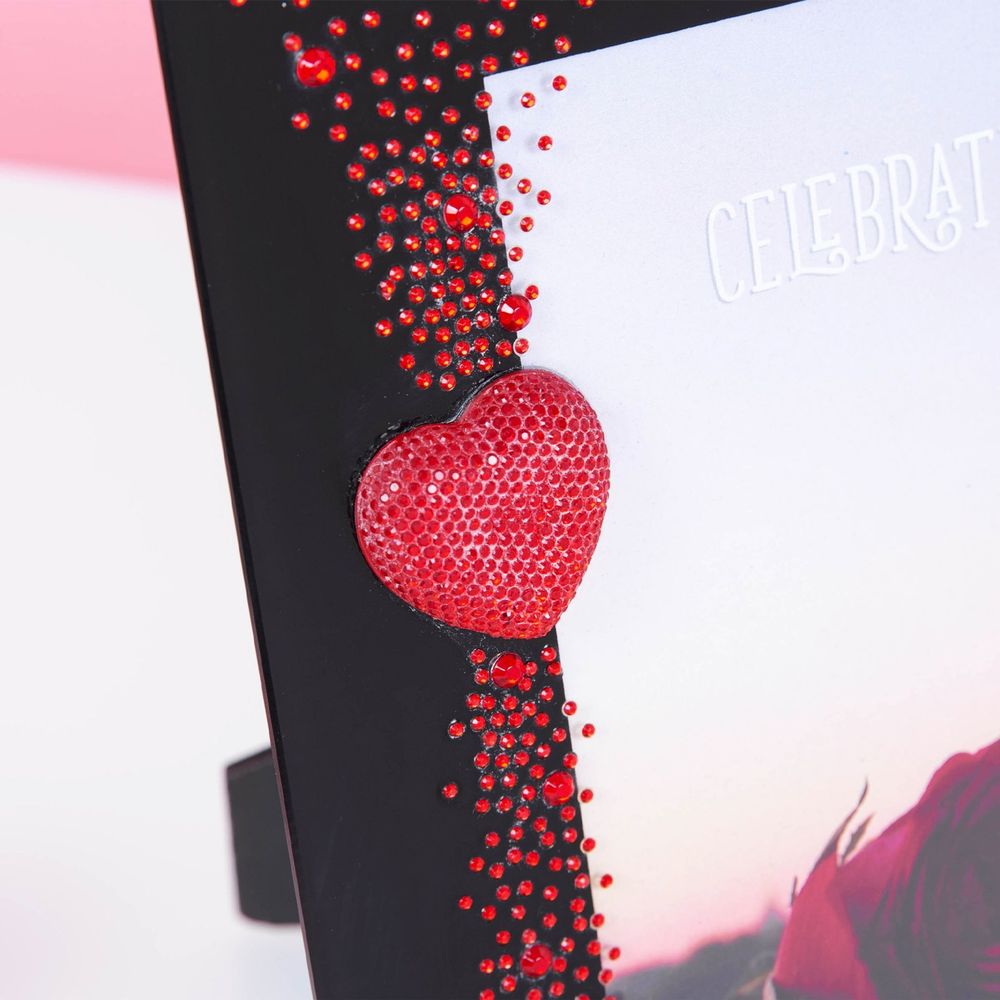 Celebrate a precious memory with your beloved with this black glass and red gem heart photo frame.