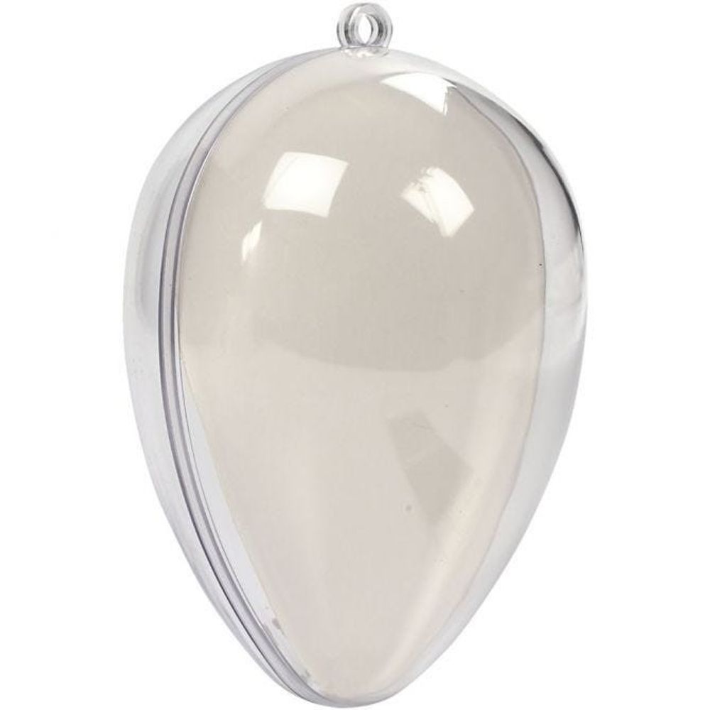 Two-part hanging plastic egg-shaped bauble to decorate with paint or fill with ornaments and collectables. Loose cardboard posts included to decorate.