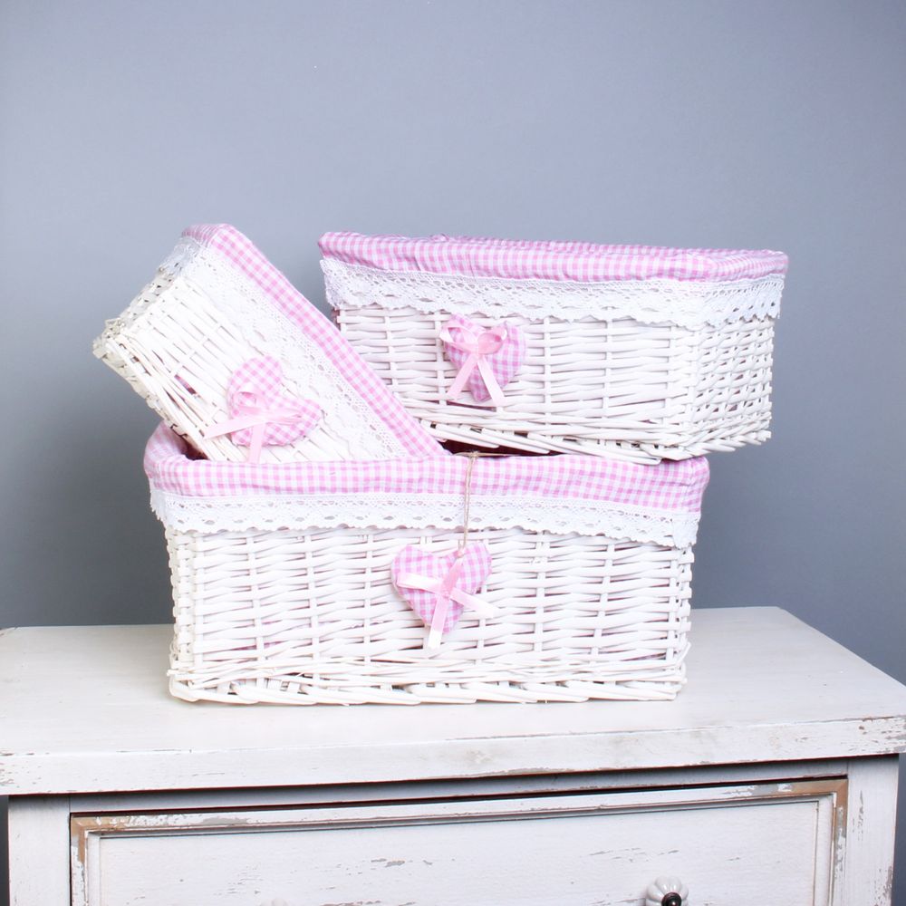 Set of 3 white baskets with pink checked liner and heart.
