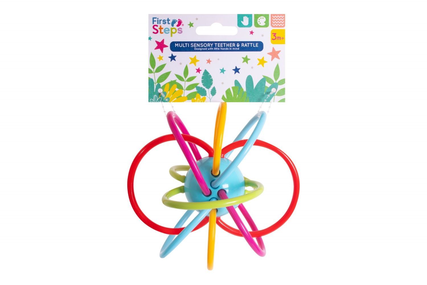 This multi-sensory teether & rattle has been designed with little hands in mind and is suitable for ages 3 months +. Designed to soothe sore gums and keep your baby content the soother also features multicoloured loops for visual stimulation.