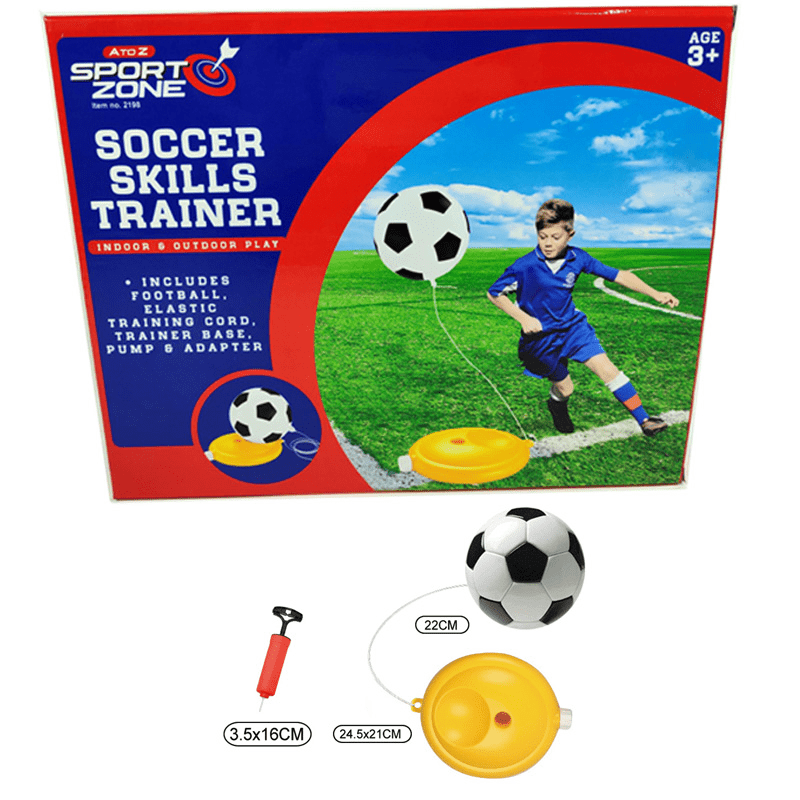 Perfect your soccer skills at home with our football trainer. Featuring a football, elastic training cord, trainer base, pump and adapter.