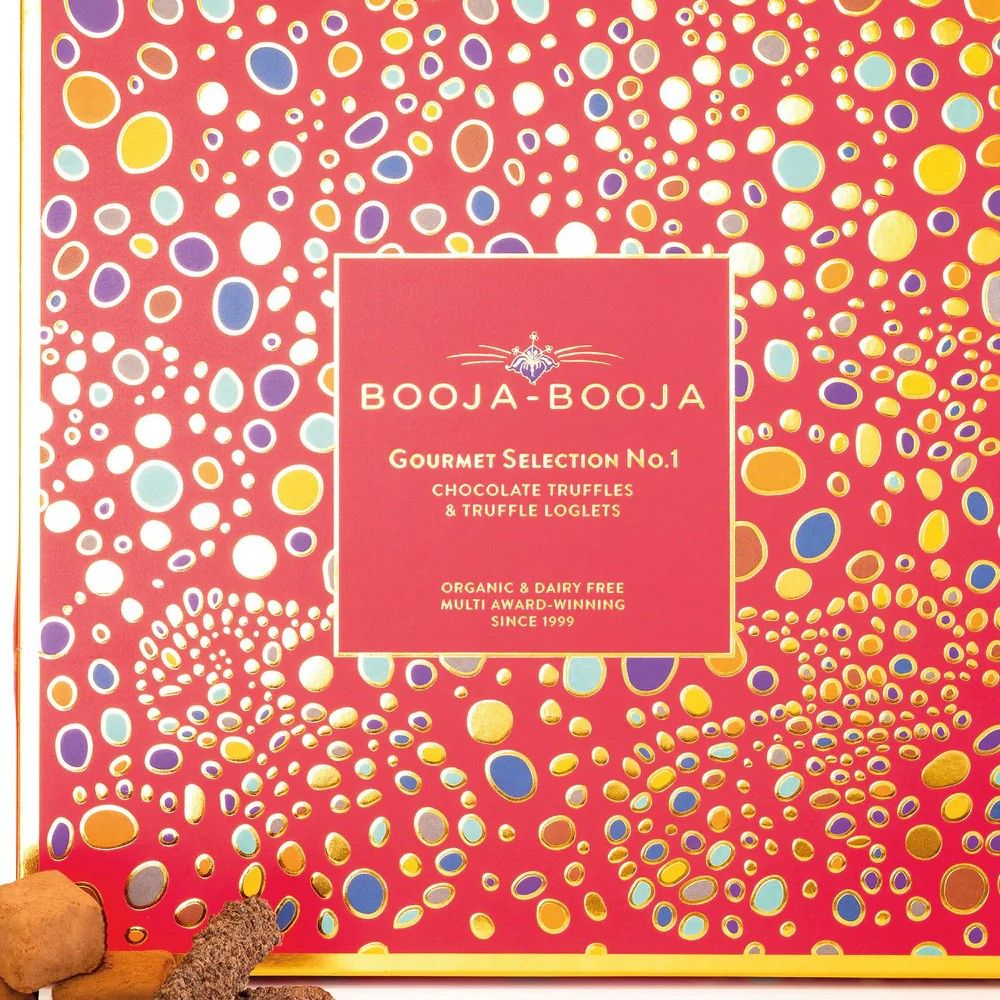 A delicious selection of twenty five chocolate truffles, truffle loglets, and a truffle star. Each with its own abundant melt-in-the mouth character that invites you to sit down, relax, enjoy; and linger. Welcome to the wonderful world of Booja-Booja where carefully chosen organic ingredients are whisked and whirled to perfection. Includes: Hazelnut Crunch, Honeycomb Caramel, Cherry Bakewell, Gingered Toffee Apple, Almond Salted Caramel, Chocolate Orange & Salted Caramel Mocha.