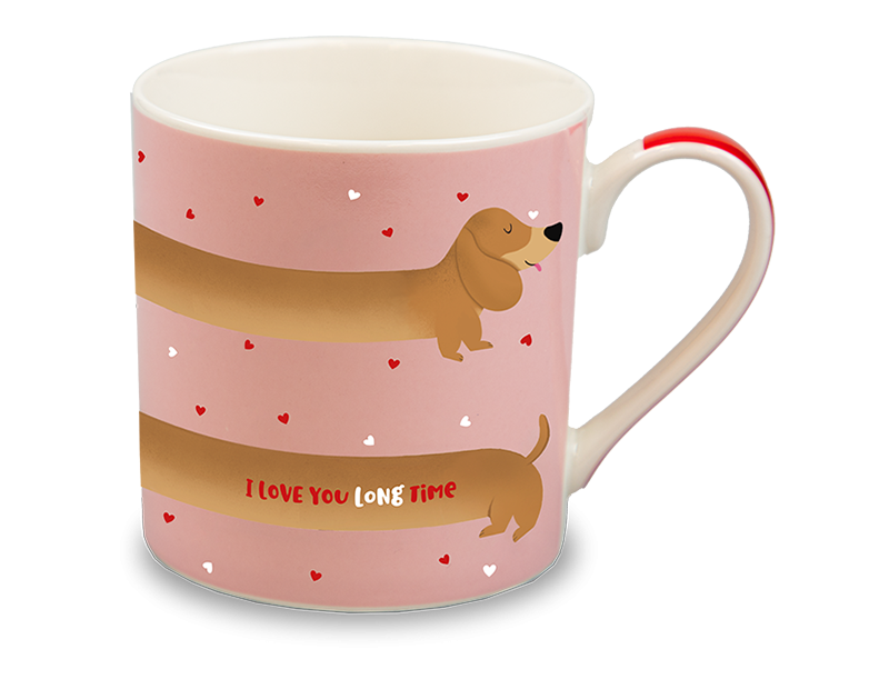 Add a touch of whimsy to your day with our adorable Valentine’s Sausage Dog Print Mug. Made from durable ceramic, this charming mug is perfect for savoring your favourite beverages. It features a delightful wrap-around design in soft pink, adorned with red and white hearts, a lovable sausage dog illustration, and the playful quote "I love you long time." Both practical and endearing, this mug makes a heartfelt gift for Valentine’s Day or any occasion that calls for a smile. With its durable build and cheerful design, it’s a sweet way to enjoy every sip while celebrating love and laughter.