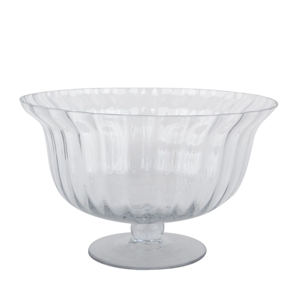 Stunning clear glass bowl with flared opening. Has smooth subtle grooves and a short stem on a round base.
