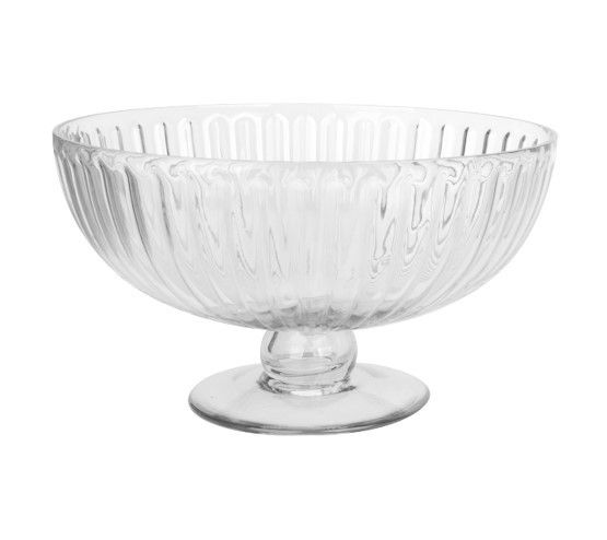 Stunning clear round glass bowl with smooth subtle grooves and a short stem on a round base.