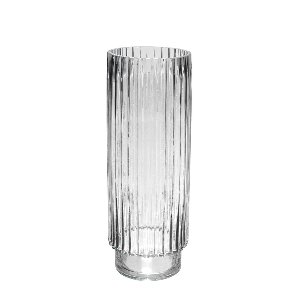 A wide cylinder shaped ribbed clear glass vase with a stepped base measuring 40cm high by 15cm wide.