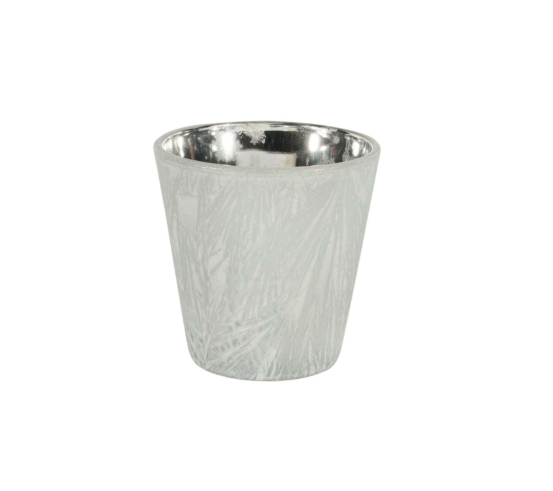 A white votive candle holder, with a frosted finish, ideal for any winter display.