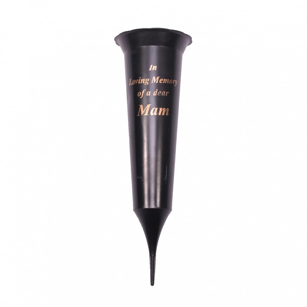 A black spiked grave vase, with a detailed text in a gold scroll font reading 'In Loving Memory of a dear Mam'