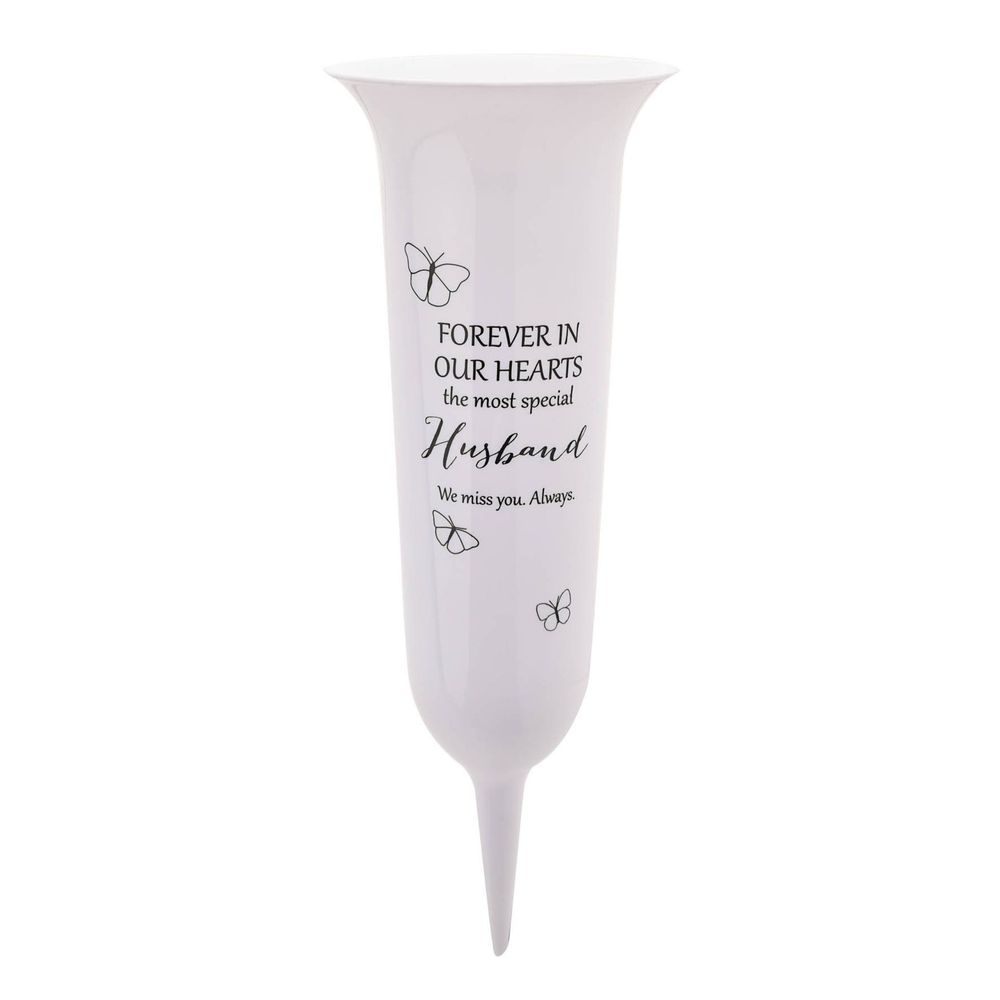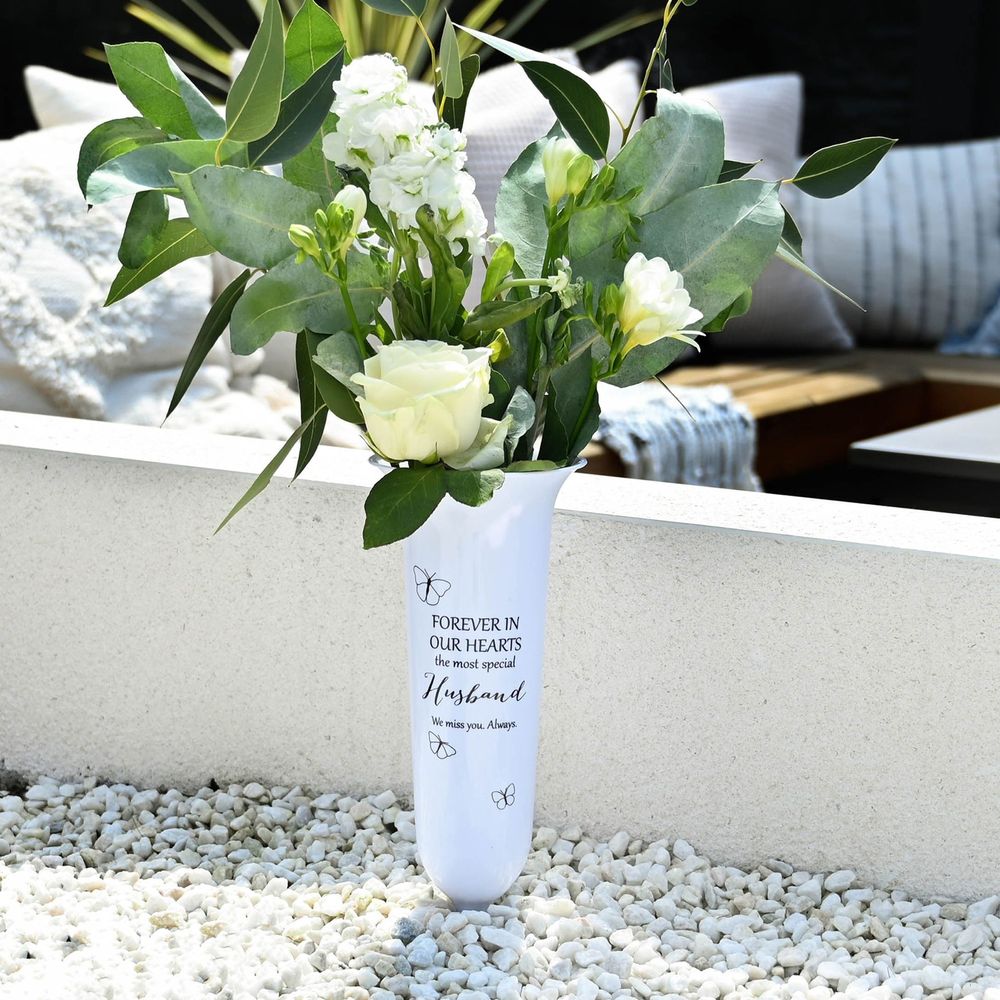 The white plastic vase features a ‘Forever in Our Hearts’ printed decal alongside butterfly imagery. Its pointed base is designed for penetrating the ground, whilst its wide neck opening allows ample room for flower arrangements.