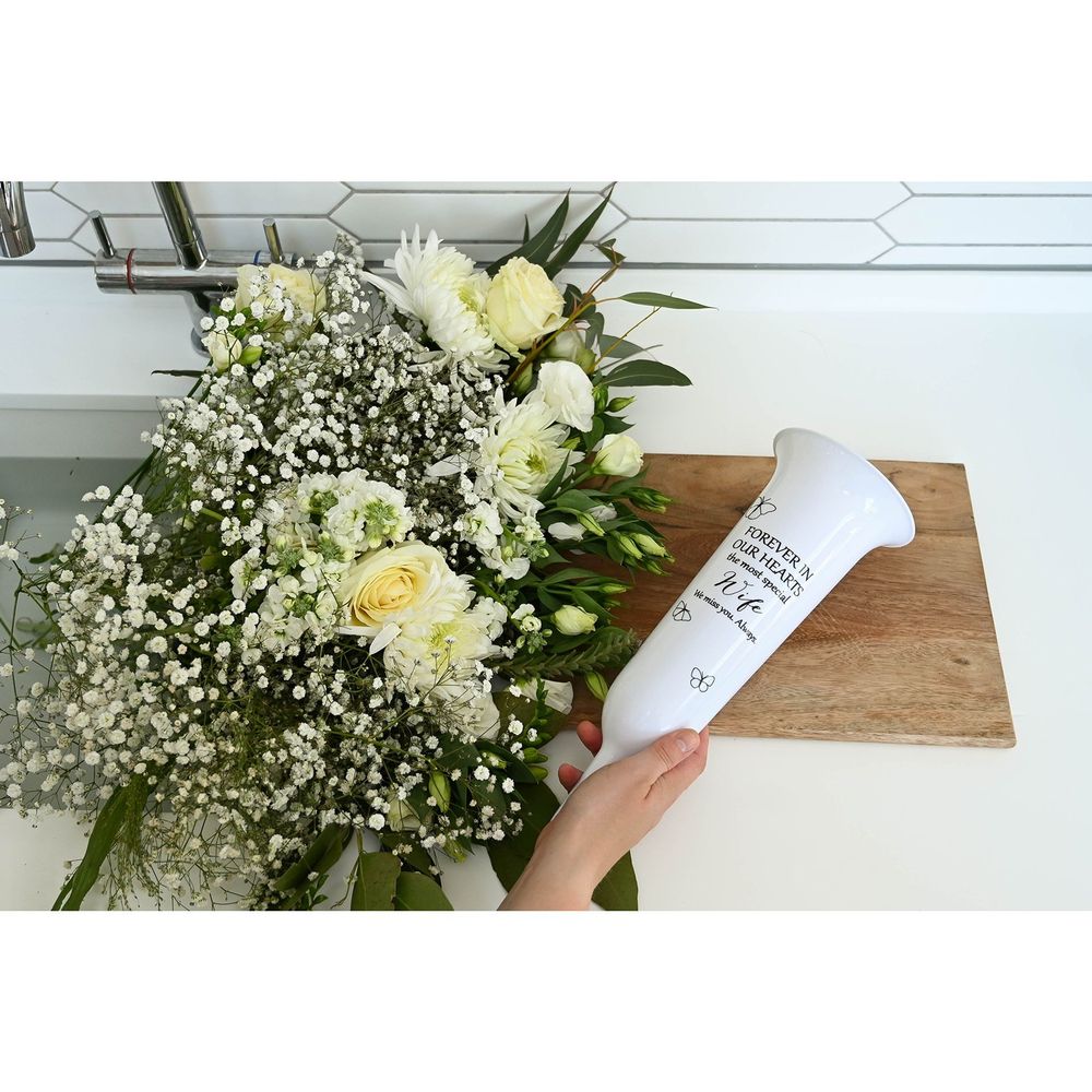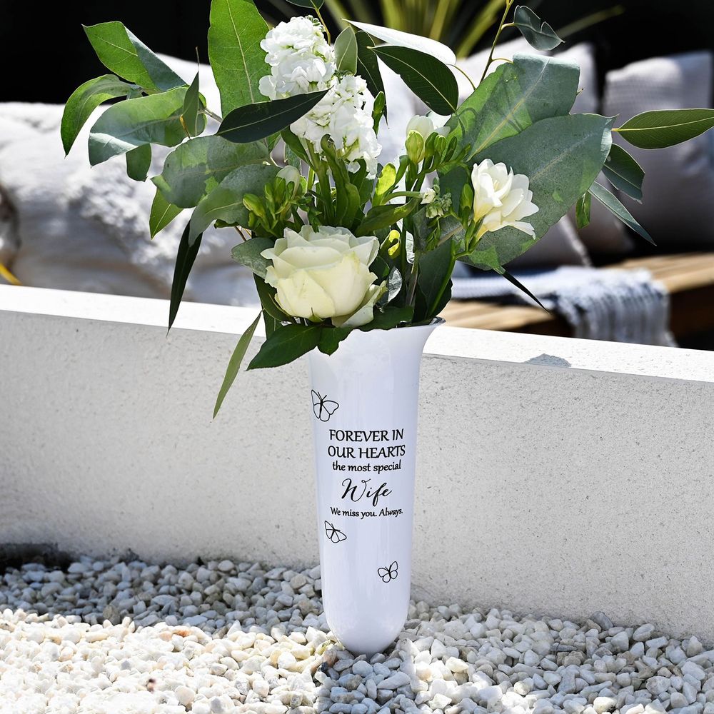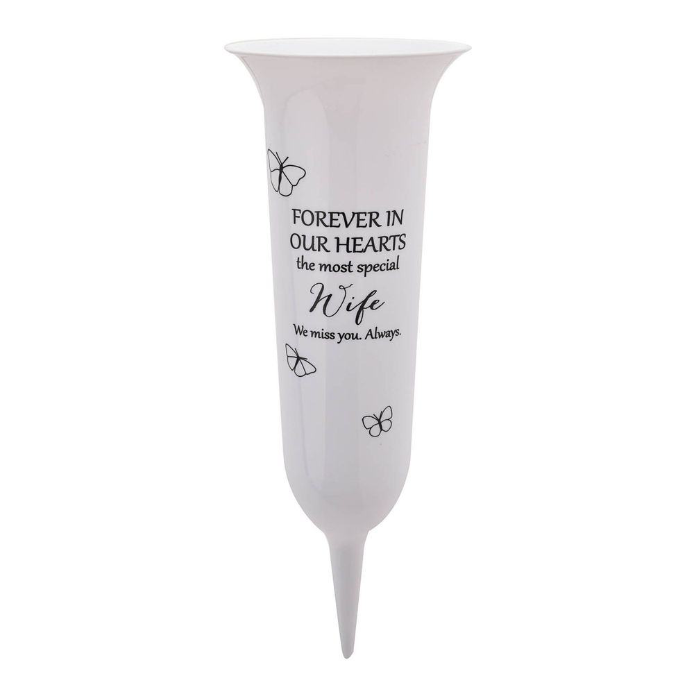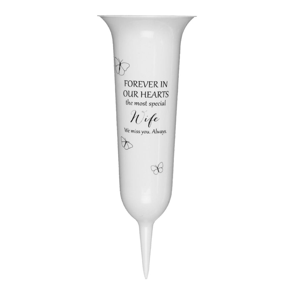 The white plastic vase features a ‘Forever in Our Hearts’ printed decal alongside butterfly imagery. Its pointed base is designed for penetrating the ground, whilst its wide neck opening allows ample room for flower arrangements.