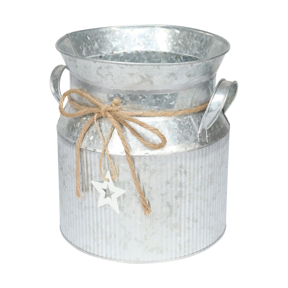 Embrace rustic charm with our Zinc Milk Churn featuring Vertical Ribs and a tasteful Jute Bow. The ribbed design adds texture, creating a captivating focal point for your decor. Adorned with a charming white wooden star, this piece seamlessly blends vintage aesthetics with contemporary appeal.