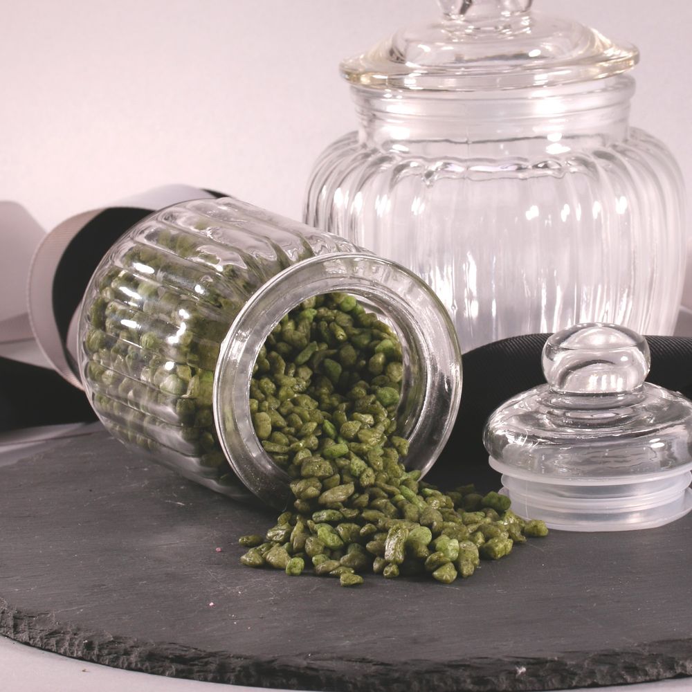 Add some colour to your vases with this jar of decorative moss green pebbles.