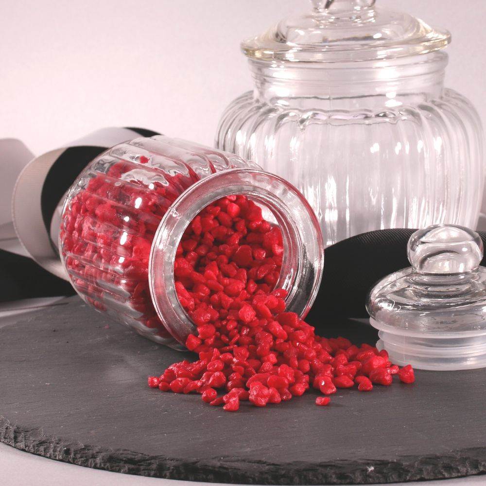 Add some colour to your vases with this jar of decorative red pebbles.